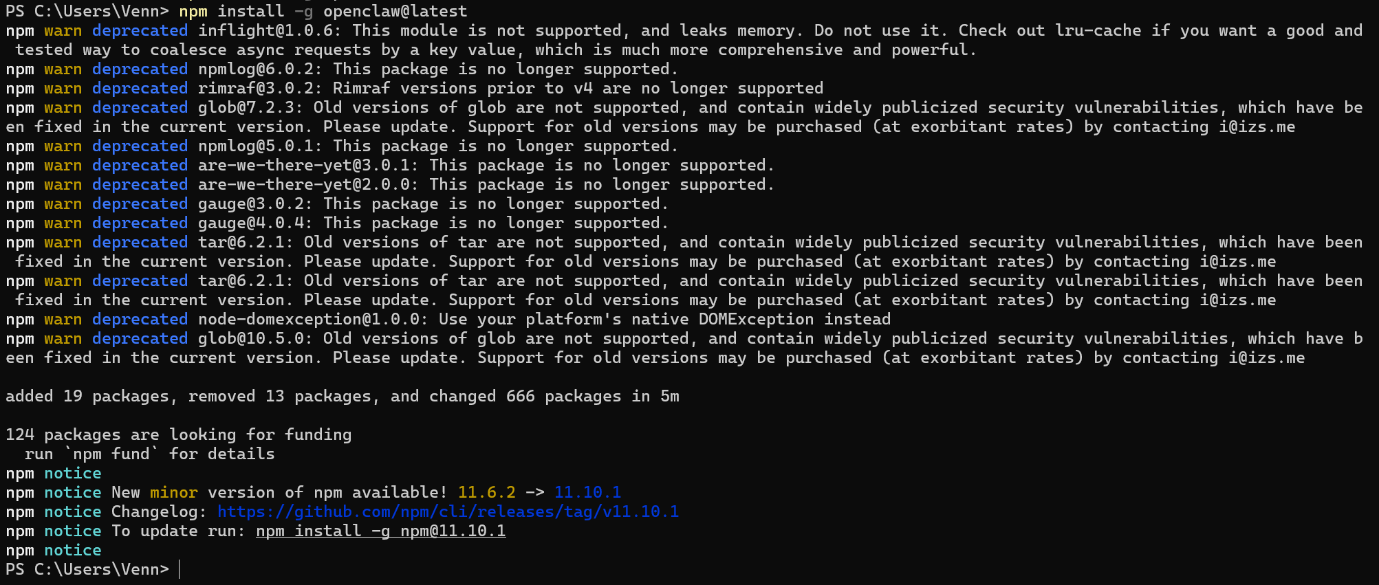 npm install -g openclaw@latest // 安装, 耗时略久,稍等片刻