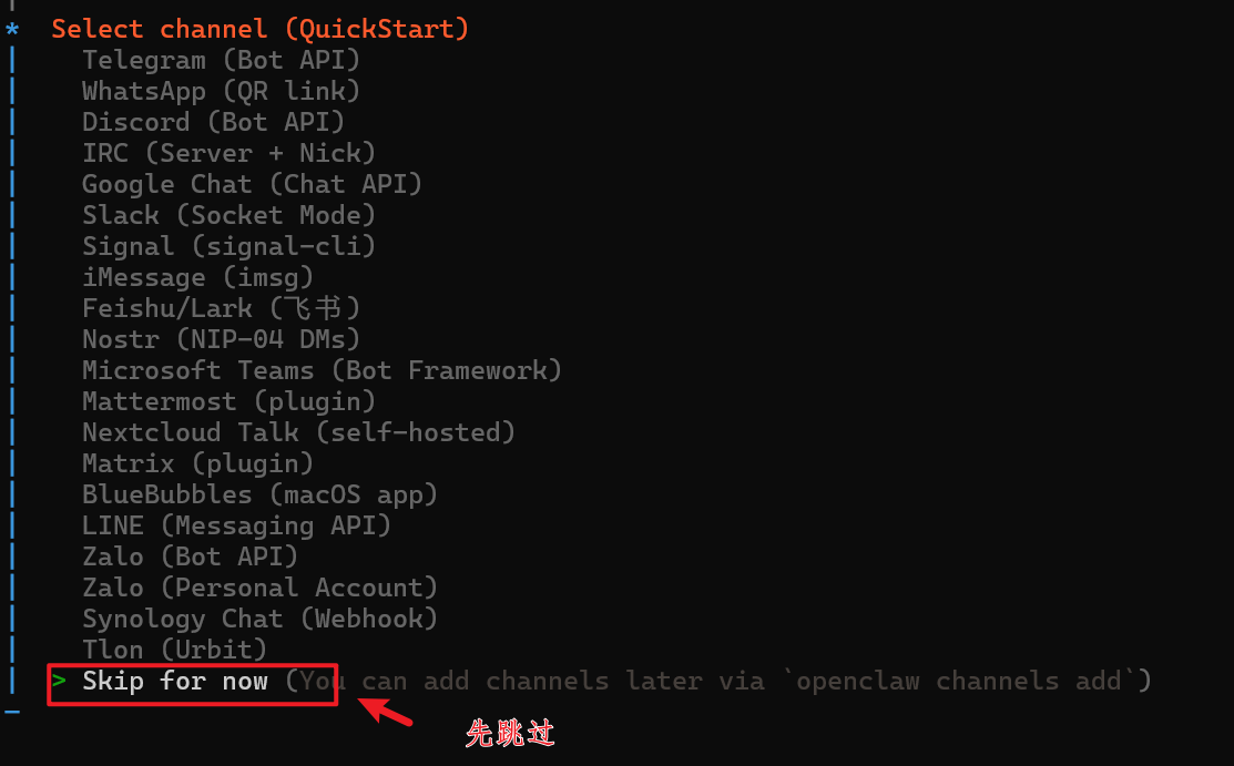 向导会让你选择 AI 模型、是否连接即时通讯平台等选项。若只想先跑通本地流程,可以选择跳过连接即时通讯平台,后续再单独安装飞书插件。