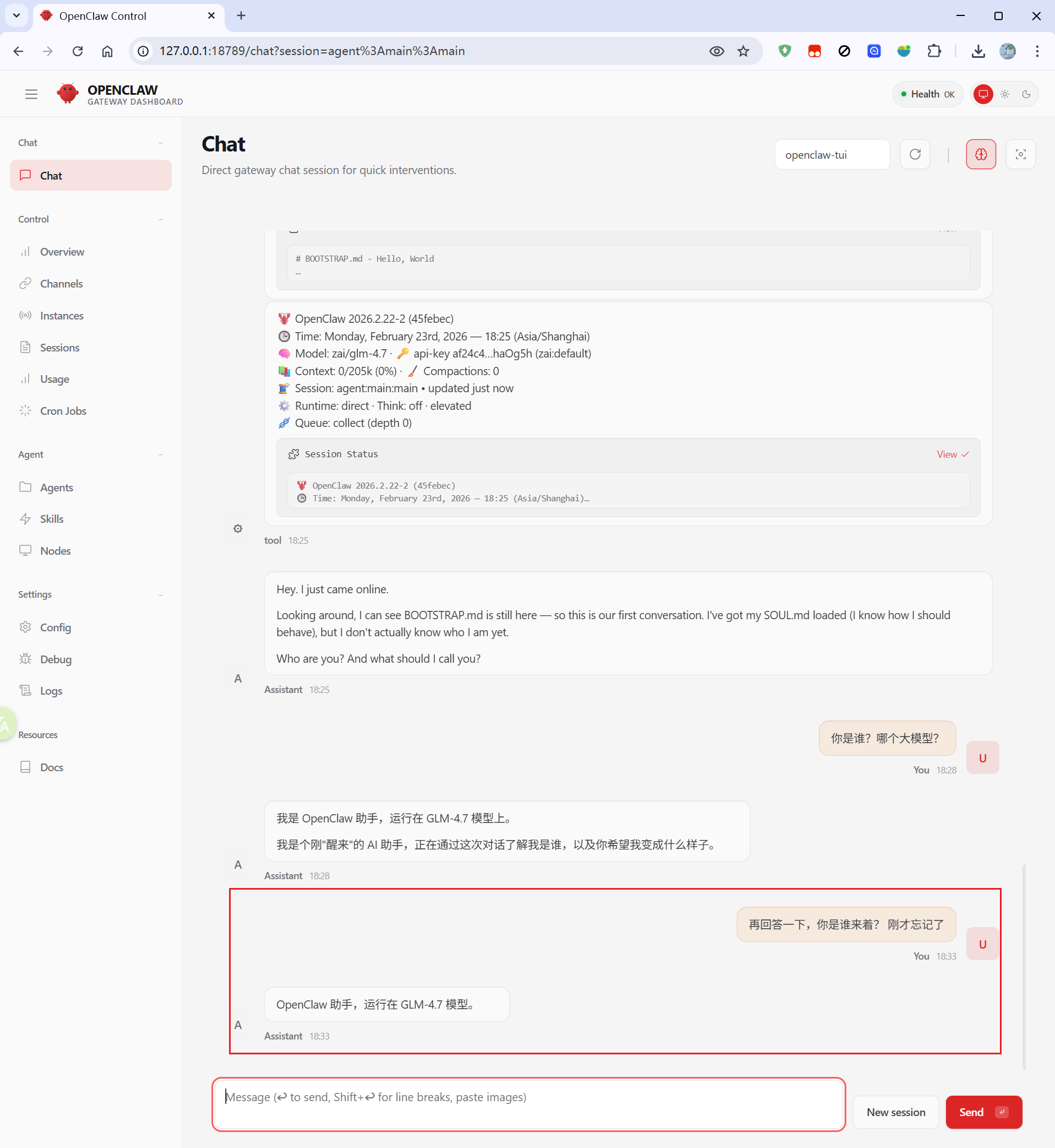 当控制台服务启动后,直接浏览器输入 http://127.0.0.1:18789/ 就可以进入这个页面。