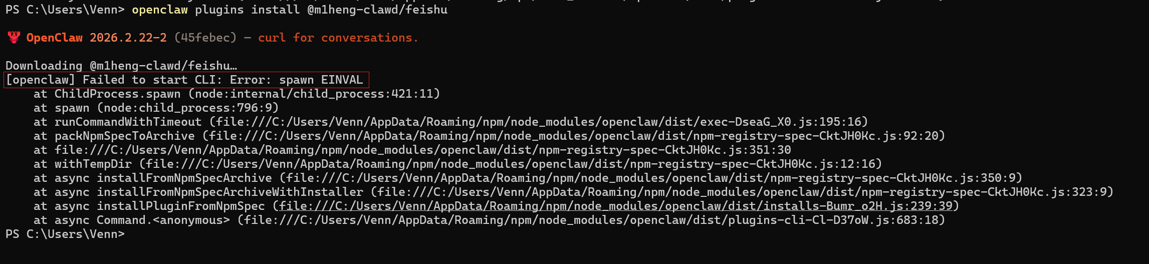 - 博客园 - openclaw安装飞书插件时报错 spawn